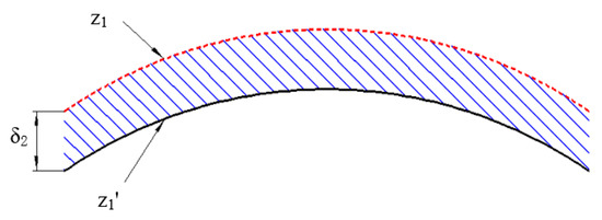 Section 2.1 introduces the compensation for the clamping error, but a weak-stiffness mirror will also produce a larger cutting error, mainly due to cutting deformation in the actual machining process. As shown in Figure 4, according to the description in Section 2.1, the machining trajectory for the first machining is z1, but the actual machining trajectory is z1’ under the influence of the cutting error δ2.