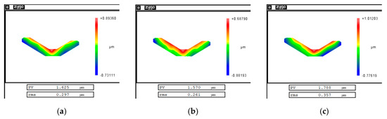 From the experimental and simulation results, it can be seen that the clamping force of the extreme ultraviolet glue produced a clamping deformation with PV value of 5 µm on the machined surface. As shown in Figure 10d, it can be seen that the maximum stress was 20 MPa, which is far less than the yield limit σs of 275 MPa of the aluminum alloy material. According to the analysis in Figure 8, we can reach the conclusion that the mirror surface only has elastic deformation.