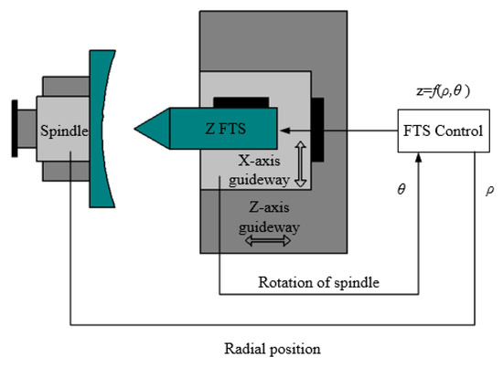In order to meet the basic requirements for error compensation, an ultra-precision cutting system based on FTS technology is established, as shown in Figure 6. The ultra-precision cutting system consists of the Z-axis, X-axis, and C-axis of the ultra-precision machine and FTS. During processing, the workpiece rotates with the C-axis, and the X-axis feeds along the radial direction of the workpiece. The FTS calculates the feed amount z required for the current machining position according to the current spindle angle θ and the X-axis position (i.e., the radial position of the workpiece) ρ, and then drives the diamond tool to perform a quantitative feed motion along the Z-axis to cut the workpiece. Since the feed amount z of the fast tool servo system is a function of the spindle angle and the position of the X-axis z = f(ρ,θ), it can realize machining with arbitrarily distributed errors. The working frequency of the Z-axis of the system is greater than 500 Hz, and the working stroke is greater than 100 µm.