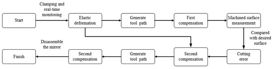 One of the main machining difficulties of weak-stiffness mirrors is that after disassembling the mirror, the mirror surface will spring back and destroy the original machined surface. The magnitude and distribution of the springback is uncertain because it is difficult to accurately control the magnitude of the clamping force. The common solution to this problem is the optimization of the clamping method for controlling the clamping deformation within an acceptable range [5]. Pan et al. analyzed the effect of clamping force on the thin-walled part deformation at different clamping positions and obtained the nonlinear relationship between contact force, contact deformation, and contact area, which is beneficial for reducing clamping deformation [6]. Miao et al. chose a low rigidity shell part as a research target, the machining process was designed and analyzed, different clamping schemes were designed for this part, and the comparison and analysis were finished by using the finite element method [7]. However, the clamping method is different for various mirrors, and it is difficult to control the clamping error within two λ. Second, the machining process of weak-stiffness mirrors will produce large cutting errors due to cutting deformation, machine motion errors, servo system tracking errors, and other factors [8,9]. Many models have been established to describe the cutting errors during the cutting process [10,11]. Liu et al. established a model of machining errors in three-axis ultra-precision lathes based on the theory of multi-body systems [12]. Zhou et al. established an orthogonal cutting force analysis model based on unequal parallel-edge shear bands and proposed a cutting force prediction algorithm [13]. However, various errors are coupled with each other in the cutting process, and it is difficult to establish an accurate model to describe these cutting errors.