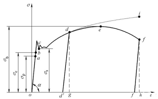 As shown in Figure 8, when the clamping force acts on the surface of the aluminum alloy, with the yield limit σs as the boundary, the work done by the clamping gradually accumulates in the material as elastic deformation energy and then produces elastic deformation. With the gradual increase in the degree of deformation, the accumulation of plastic deformation energy starts to occur after passing the yield point b, and then plastic deformation occurs [24]. According to the Mises yield criterion, Mises considers yield as an invariant state of the material, independent of the stress coordinate system. When the equivalent stress reaches the yield limit σs, the material begins to produce plastic deformation. The equivalent stress can be obtained by Equation (8):