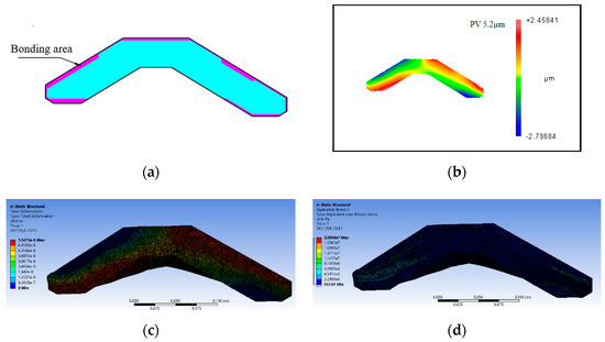 Clamping deformation simulation of a weak-stiffness mirror: (a) bonding area; (b) measurement results of clamping deformation; (c) machining surface displacement distribution map; and (d) machining surface stress distribution map.