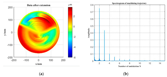 Figure 13a is the result of the mirror surface data after extension. Figure 13b shows the spectrum of the machining trajectory after extension, which is obtained by spectrum analysis. N is the number of undulations in a rotation cycle of the Z-axis. According to Equation (10), when the spindle speed n = 300 r/min and the number of fluctuations N = 15 in a rotation period, the Z-axis working frequency f = 75 Hz. The working frequency of the FTS system built in this paper is greater than 500 Hz, which meets the needs of use.