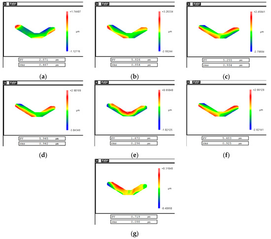 Experimental results: (a) is the measurement result before clamping; (b) is the measurement result after clamping; (c) is the elastic deformation error; (d) is the measurement result after the first machining; (e) is the cutting error; (f) is the measurement result after the second machining; and (g) is the final measurement result after disassembling the mirror.