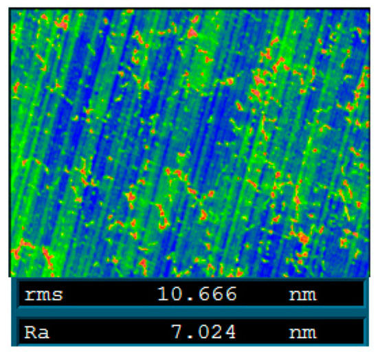 Figure 15 shows the measurement results of the mirror surface during the experiment. As shown in Figure 15c,e, there was a large clamping error and cutting error generated in this experiment. The PV value of the clamping error was 5.2 µm and the PV value of the cutting error was 1.6 µm. The PV value of the final mirror surface was 0.7 µm after two compensations, as shown in Figure 15g. Additionally, the final surface roughness Ra was better than 10 nm, as shown in Figure 16.