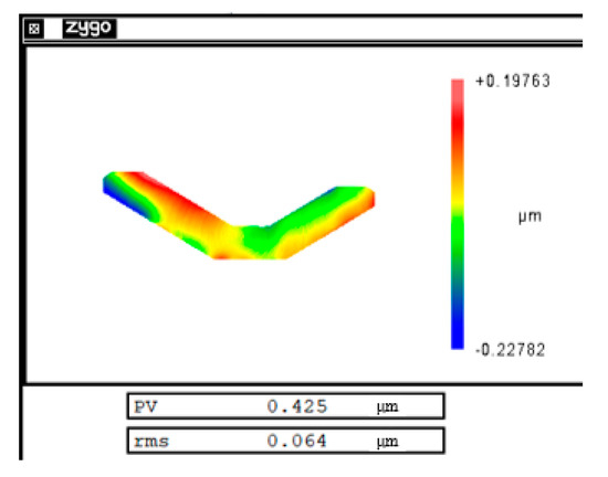 The experimental object is an infrared horizon mirror, as shown in Figure 9. The mirror is 295 mm long, 95 mm wide, 2.5 mm thick, and made of aluminum alloy with a yield limit σs 275 Mpa. In order to reduce the clamping force, the mirror is clamped by bonding, using low-stress extreme ultraviolet glue (uv-50). The glue will harden only after being irradiated by ultraviolet light. The bonding area is shown in Figure 10a. Figure 10b shows the magnitude and distribution of the clamping deformation obtained by measuring the mirror surface before and after clamping. Due to the complexity of the stresses generated by bonding, forced displacements are applied to the machined mirror surface based on the measured clamping deformation. Then, the stress distribution on the machined surface is obtained by the Mises yield criterion, as shown in Equation (8) [25]. The finite element simulation software was ansys workbench 19.0, the element was solid186, and the number of elements was 642485. Figure 10c is a displacement distribution diagram of the machining surface and Figure 10d is a stress distribution diagram of the machining surface.