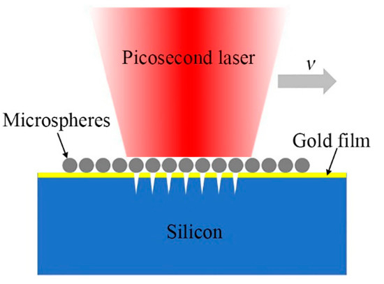 A commercial laser device with a central wavelength of λ = 1064 nm was used (BGL-1064-30B, BWT Laser Ltd., Tianjin, China), which generated 15 picosecond laser pulses. The repetition rate of the laser is 200 kHz. The beam quality factor M2 is smaller than 1.4. The laser polarization direction is perpendicular to the laser scanning direction. The laser beam was focused on the sample surface to a focal spot diameter of 80 μm (1/e2 intensity). The maximum laser fluence was limited to 7.16 J/cm2. The specimens used in the experiment are <100> oriented silicon substrates (Hefei Kejing Materials Technology Co., Ltd., Hefei, China) with dimensions of 10 × 10 × 0.5 mm3 (length × width × height), which were polished on top surface with surface roughness (Sa) <5 Å. A self-assembled monolayer of 1-μm-diameter polystyrene microspheres was applied on the silicon surface in order to assist picosecond laser to fabricate nanohole arrays. To improve the surface morphology of silicon nanoholes, a 10 nm-thick gold film was deposited on the silicon substrate. The specimen was mounted onto a micro-processing platform, and the picosecond laser was focused on the specimen surface. As shown in Figure 1, the microspheres within the irradiated area focused the incident laser beam into nanometer scale, and nanoholes were generated on silicon substrate. Moreover, large area nanoholes can be obtained by laser beam scanning. And the scanning speed (v) of the laser is 6000 mm/s.