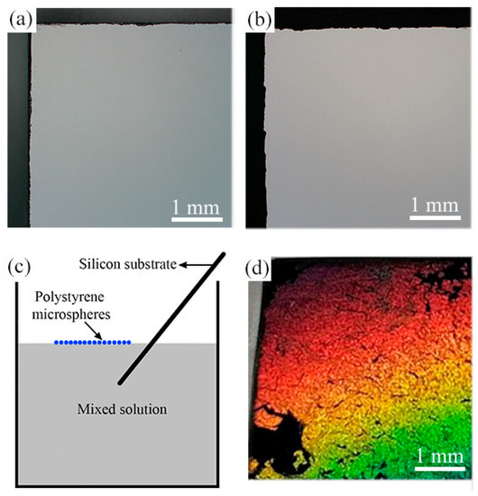 Optical microscope images of (a) uncoated silicon substrate and (b) gold-coated silicon substrate. (c) Schematic diagram of transferring a monolayer of polystyrene microspheres on solution surface to the silicon substrate. (d) Optical image of the monolayer of polystyrene microspheres on the gold-coated silicon surface.