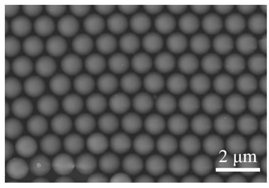 The contact angle of the silicon substrate is 95.7°, which was measured by contact angle measuring instrument (JC2000D, Powereach, Shanghai, China). Therefore, the silicon substrate is hydrophobic, which is not conducive to the adsorption of microspheres on the silicon surface. In order to improve the hydrophilicity of the silicon substrate, the silicon substrate was placed in the piranha solution to stand for 24 h. After the hydrophilic treatment, the contact angle of the silicon substrate was reduced to 15.5°. Monolayer densely-arranged polystyrene microspheres on solution surface were transferred to the silicon surface using the method given in [24]. The detailed steps of the transfer method are described as follows. First, dip the silicon substrate without gold film (Figure 2a) and with gold film (Figure 2b) into the beaker at a certain angle, then slowly move the silicon substrate below the polystyrene microspheres (Figure 2c), and slowly lift the silicon substrate, so that the mono-dispersed polystyrene microspheres can be transferred onto the silicon surface. Finally, put the silicon substrate covered with polystyrene microspheres into the oven for drying, and a hexagonal monolayer of polystyrene microspheres on the silicon surface can be obtained. The optical microscope image of the monolayer of polystyrene microspheres on the gold-coated silicon surface is shown in Figure 2d. The SEM image of a hexagonal monolayer of polystyrene microspheres on the silicon surface is shown in Figure 3.