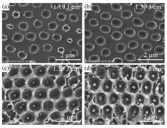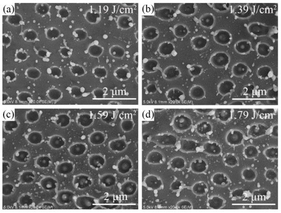 Figure 4a–d shows scanning electron microscopy (SEM) images of the nanohole arrays on silicon substrate fabricated by picosecond laser with 1.19, 1.39, 1.59, 1.79 J/cm2 laser fluences, respectively. One can see that there are no polystyrene microspheres on the silicon substrate after laser irradiation. This is because the microspheres are easily removed by ablation due to the low ablation threshold of polystyrene [25]. Furthermore, many undesired particles with diameters of 50–200 nm have emerged around the nanoholes, and pronounced molten materials are observed at the edge of the nanoholes. At laser fluences of 1.19–1.59 J/cm2, the shape of the nanoholes is circular. However, as laser fluence further increases to 1.79 J/cm2, some nanoholes become larger with an ellipse shape and stick together, as shown in Figure 4d. Moreover, as the laser pulse energy is larger than 1.39 J/cm2, nano-bumps develop in the center of the nanoholes (see Figure 4b–d).