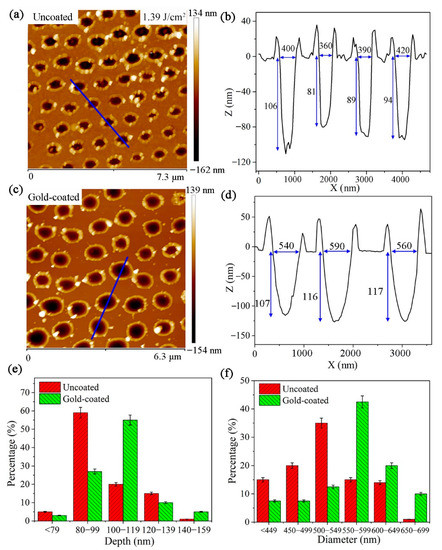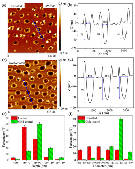 The diameters and depths of nanoholes can be get from the cross-sectional profiles of the nanoholes which were measured by AFM. As seen in Figure 6b, the depths of the three selected nanoholes on uncoated silicon substrate are 71, 87, and 69 nm, respectively, and their diameters are 380, 380, and 350 nm, respectively. While the depths of the three selected nanoholes on gold-coated silicon substrate are 97, 86, and 85 nm, respectively, and the corresponding diameters are 490, 460, and 490 nm, respectively. We further made a statistical analysis of the diameters and depths of the nanoholes within the measurement area of AFM. Figure 6e,f show the depths and diameters distributions of all the nanoholes in Figure 6a,c, respectively. It can be seen that, for nanoholes on uncoated silicon substrate, the depths of nanoholes are mainly distributed from 60–79 nm, and their diameters are distributed in the range of 250–499 nm. For nanoholes on gold-coated silicon substrate, the depths and diameters of the nanoholes are mainly distributed in domain from 80–99 nm and 450–499 nm, respectively. This indicates that the gold film can also increase the depths and diameters of the nanoholes compared to those of nanoholes on the uncoated one.