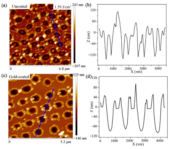 In order to more intuitively show the internal morphology and size of the nanoholes, Atomic force microscopy (AFM) was used to evaluate the internal morphology and size of nanoholes created on silicon substrate coated with and without gold film. Figure 6a,c shows the AFM morphology of nanohole arrays produced with 1.19 J/cm2 laser fluence for uncoated and gold-coated silicon substrate, respectively. The cross-sectional profiles of the three selected nanoholes in Figure 6a,c are depicted in Figure 6b,d, respectively. In Figure 6b, the cross-sectional profile of the nanoholes on the uncoated silicon substrate is not smooth. From Figure 6d, one can see that the cross-sectional profile of the nanoholes on the gold-coated silicon substrate presents a smooth parabolic curve. This means that the gold nanolayer makes the inner surface of the silicon nanoholes smoother.