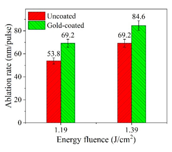 The ablation rate of nanoholes was calculated by ablation depth per pulse. As shown in Figure 9, at 1.19 J/cm2 laser fluence, the ablation rate of the nanoholes is 53.8 nm/pulse for the uncoated silicon substrate and 69.2 nm/pulse for the gold-coated one. This indicates that the ablation rate of nanoholes on gold-coated silicon substrate was increased by 28.6% compared with that of nanoholes on uncoated one. As the laser fluence was increased further to 1.39 J/cm2, the ablation rate of nanoholes on gold-coated silicon substrate is 84.6 nm/pulse, which increases by 22.3% compared with that (69.2 nm/pulse) of nanoholes on the uncoated one.