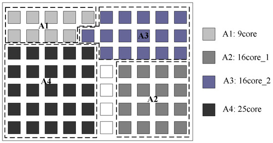Based on the existing NoC platforms, much research addressing the application mapping problem has been undertaken in recent years. However, much of this research has been carried out using single-application mapping [5,6,7,8,9,10], and only a few multi-application mapping methods were proposed. Murali et al. first presented a methodology to map multiple use-cases onto NoC architecture, satisfying the constraints of each use-case [11]. A multi-objective adaptive immune algorithm which considered different various delay constraints for multi-application mapping was proposed in [12]. In these studies, multiple applications reused the same platforms in different time slots. The main drawbacks of these systems were the time overhead incurred by reconfiguring the NoC and loading new applications, and the fact that multiple applications were not considered to execute in parallel. Yang et al. [4] proposed a multi-application mapping method to identify an optimal mapping region for each application. However, it dealt with multiple applications sequentially on a fixed platform. The applications mapped later may have fewer choices, which is not equitable for these applications. A fault-tolerant multi-application mapping algorithm was proposed by Khalili et al. [13]. The main goal of the algorithm was to map an application to free non-faulty processing cores and identify the best spare core placements. Zhu et al. [14] proposed an efficient heuristic-based algorithm for solving the issue of balancing minimized on-chip packet latency with performance-awareness in the multi-application mapping of chip-multiprocessors. Khasanov et al. [15] proposed an algorithm to map applications on heterogeneous multicore systems. However, all these studies focused on the scheduling of threads or tasks in each application.