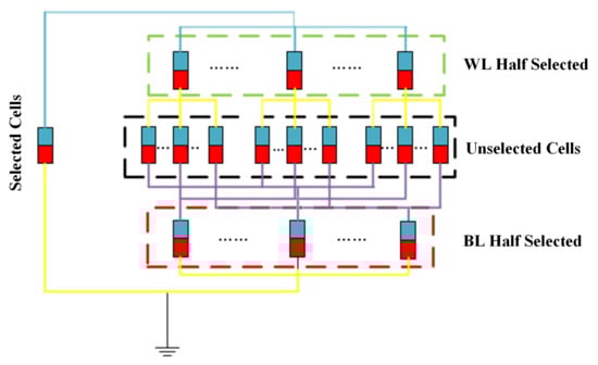 Compared with the 2-D RRAM array [28,29], there are more sneak paths in the 3-D RRAM array, so the leakage current in the 3-D VRRAM array passes through more RRAM cells, resulting in greater additional energy loss. Therefore, it is important to evaluate the leakage current in the early stages of 3-D VRRAM array design. The complete nonlinear I-V characteristics of the RRAM device are not included in the SPICE simulation because including them greatly reduces the simulation speed and requires more memory resources to evaluate the performance of enormous array size. However, compared with other work that used the simple analytic approximation model for the array investigation [30,31], our HSPICE simulation method based on modular analysis is more accurate. We developed a 3D circuit module, as shown in Figure 4 for the HSPICE simulation. The model proposed in this article can be divided into four parts: the red resistor represents the selected RRAM cell; the green resistors represent half-selected RRAM cells on the same WL; the yellow resistors represent half-selected RRAM cells on the same BL; and the gray resistors represent unselected RRAM cells.