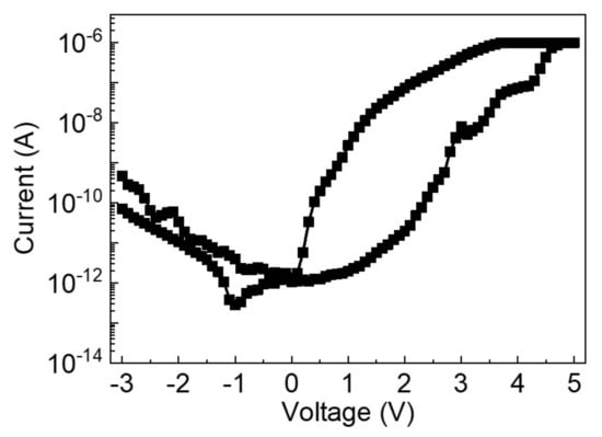 The I-V characteristic of the HfO/TaO based built-in nonlinear 3-D VRRAM architecture is shown in Figure 7. It can be seen from the figure that, when the compliance current is set to 1 µA, the resistance switching window of the device is still very large, which proves that it can normally work at currents of nA level. Compared with many RRAM devices that need to work at µA currents, this device has the advantage of low power consumption. Therefore, the leakage current must be strictly limited to avoid additional power consumption and to maintain its low power consumption characteristics. It is worth mentioning that, although the scan loop of the voltage is 0 V to 5 V, this does not indicate that the device requires a 5 V write voltage. In fact, a pulse voltage of approximately 2.5 V is sufficient to write to the device. Although the resistance ratio on the negative current range is lower than the positive range, this does not affect the switching mode of the device because all of the cells in the array are read in the positive range. When designing the peripheral circuit, the designer only needs to pay attention to the window that displays the forward curve.