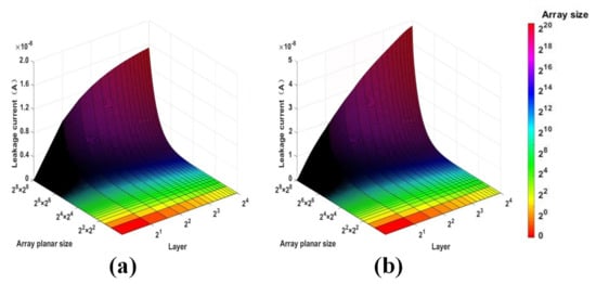 (a) Read leakage current under different array sizes and (b) write leakage current under different array sizes (from to and 1~16 layers).