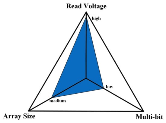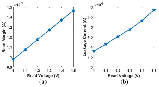 The read and write voltage distribution of the novel BNR cell is shown in Figure 6b. It can be seen from the Figure that the range of the write voltage is 1.8–2.5 V, so (write voltage) is set to 3 V in this simulation to obtain a 0.5 V liberality, while making /2 = 1.5 V to avoid intrusion to the half-selected area. To explore the effect of the read-voltage on the leakage current, (read voltage) is set to 1–1.5 V. Furthermore, we use the worst cell patterns proposed in Table 2 to analyze the worst-case leakage current [32].