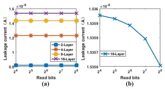 (a) The leakage current of multi-bit (from to ) parallel read under different layers (from 2 to 16), (b) the leakage current under various parallel reading bits when the number of stacked layers is 16 (planar array size is ).