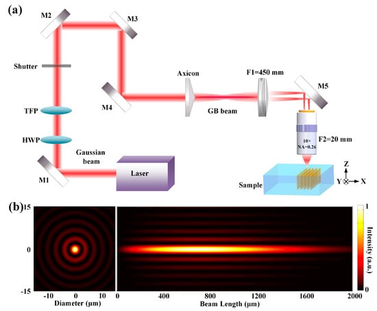 An amplified Yb: KGW femtosecond laser oscillator (Pharos, Light Conversion, Lithuania) was employed as the irradiation source with 220 fs, 100 kHz, and 1030 nm. The schematic of the fs–laser fabrication is shown in Figure 1a. The pulse energy can be continuously adjusted utilizing a thin–film polarizer (TFP) and a half–wave plate (HWP). An axicon with a nominal base angle = 1° was used for providing a first Bessel region. Further, a 4f system (a factor of 22.5) composed of a convex lens (f1 = 450 mm) and a microscope objective (10×, NA = 0.26, f2 = 20 mm, Minutoyo NIR, Japan) was employed to get a second Bessel region adapted for micromachining [23]. Figure 1b presents the simulations of the transverse and axial intensity distribution of the GB beam in the PTR glass. The initial Gaussian beams had a radius of 3.8 mm, while the central lobe of the GB beam was about 4.4 μm in diameter at full width at half maximum (FWHM). The length of filament in PTR glass was around 2 mm from a side view. The PTR glass was fixed on a high–precision motorized 3D mobile platform (ANT130, Aerotech, Pittsburgh, PA, USA). By translating the samples perpendicularly to the GB beam at a speed of 400 μm/s, a range of parallel filaments with interline distances of 5 μm and length of 4 mm were written 150 μm below the surface, resulting in square patterns. The pulse energy was fixed at 4 μJ/pulse. After laser exposure, the samples went through thermal treatment at 460 °C for 5 h and 540 °C for 3 h in a muffle furnace.