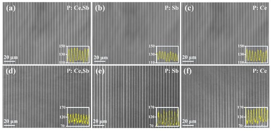 To study the difference of induced refractive index changes in the doped and undoped samples, we performed the PCM images of the microstructures in XY–plane after fs–laser exposure and subsequent thermal treatment process shown in Figure 2. In this arrangement, the black zones represent relative positive index modifications, and white regions indicate negative changes. It can be found that fs–laser irradiation led to the darkened tracks in PCM of all the samples, as shown in Figure 2a–c. The widths of the exposed regions were the same for each case (about 1 μm). Further, the darkened tracks implied type I photoinscription and indicated a soft photochemically induced refractive index increment. The increase can be induced by the structural densification process mainly caused by defects [24,25]. Meanwhile, this phenomenon implied the refractive index change of PTR glass during the fs–laser exposure process was non–negligible (Δn, 10−4~10−3) [13,26], which was totally different from the change in the case of UV exposure (Δn, 10−6) [27]. The insets (yellow curves) are the gray level distribution curves of the framed areas. As for P: Ce, Sb, and P: Ce samples, the traces showed a rather higher contrast compared to P: Sb. The increase in the contrast is probably associated with the larger quantity of the defects induced by laser irradiation when doping with Ce3+ ions due to the increased probability of nonlinear ionization, and the introduction of Sb2O3 showed a slight enhancement effect. After thermal treatment, the darkened traces totally change to white, indicating the decrement of the refractive index with respect to the matrix, as shown in Figure 2d–f. We proved such treatment of P: Ce, Sb sample can lead to the generation of NaF (nNaF~1.33) nanocrystals that had a lower refractive index compared to the matrix (nPTR~1.49) [28]. Therefore, the nanocrystals and the high residual stresses [29] around them are considered the major contributors to the decrease. Based on this mechanism, we have reason to speculate that the reduction of refractive index in P: Sb and P: Ce samples probably results from the same cause. Moreover, P: Sb and P: Ce showed a relatively higher negative refractive index contrast and nonuniformity of the structure than P: Ce, Sb, which can be associated with the density of the nanocrystals and will be our future work.