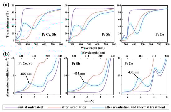 (a) Transmission spectra and (b) absorption spectra of P: Ce, Sb, P: Sb, and P: Ce samples.