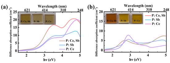 To investigate the absorption spectral changes in more detail, we also present the absorbance after deducting the absorbance of the initial untreated samples, as shown in Figure 4. It can be found that laser irradiation resulted in absorption increases at around λ = 260 nm (E = 4.78 eV) by doping with CeO2, and another λ = 353 nm (E = 3.52 eV) by co-doping with Sb2O3 in CeO2 doped sample. These results indicate that the formation of color centers as well as the SMCs can be significantly prompted by doping both (P: Ce, Sb). Furthermore, a portion of the absorption could also be attributed to Ce4+ and Ce3+ ions, which implies the ions probably take part in the nonlinear photosensitive process. This phenomenon was in accordance with the change of color of the samples in Figure 4a (inset). Compared with P: Sb and P: Ce, the yellow coloration of P: Ce, Sb had a darker appearance, indicating higher efficiency of transformations of charged Ag+ ions to Ag0 atoms and SMCs (Ag2, Ag2+, Ag3+, etc.). Subsequent thermal treatment led to darker colors of the samples (Figure 4b), particularly for P: Ce, Sb sample, reddish–brown emerges. The absorption bands at around λ = 465 nm (E = 2.67 eV), λ = 435 nm (E = 2.86 eV), and λ = 433 nm (E = 2.87 eV) were the SPR bands of Ag NPs, which were primarily dependent on the size distribution, the concentration, and the shape [11]. The mean diameters of Ag NPs are about 2–3 nm based on Mie–Drude theory [32]. And according to the area of the absorption peak of Ag NPs, the concentration of Ag NPs decreased significantly for P: Sb.