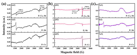 To further obtain specific structural information about the role of these dopants during the nonlinear photo–thermal process, samples were ground into a powder with the same mass and placed in quartz tubes. Continuous–wave EPR measurements of the powdered samples are displayed in Figure 5. A clear, sharp signal was observed in the pristine P: Ce, Sb sample (Figure 5(a1)), in which the magnetic field was around 1580 G, corresponding to the electron’s g–factor of around 4.27. Meanwhile, there was also a weak signal around 3362 G (g = 2.03), and both signals can be attributed to Fe3+ ions [33] that were introduced in the refining process. Significant changes occurred in the EPR spectra of the fs laser–irradiated P: Ce, Sb sample in comparison with the pristine sample (Figure 5(b1)). A new signal near 3121 G (g = 2.16) appeared that can be associated with the superimposing signals of Ag0 neutral atoms and Ag2+ molecular ions [34]. In addition, another new sharp signal near 3360 G (g = 2.007) can be assigned to Si–E′ centers [35]. Other defects that existed in our glass sample could not be detected here because of the experimental limitations. Then further thermal treatment (Figure 5(c1)) resulted in the near disappearance of the defect signal. Similarly, the pristine P: Sb sample (Figure 5(a2)) owned a relatively intense signal of Fe3+ ions, while a weak signal of Si–E′ for the irradiated sample Figure 5(b2)). The signal of Fe3+ ions still existed obviously after thermal treatment (Figure 5(c2)). As for the P: Ce sample, the signal of Fe3+ ions was weak before irradiation (Figure 5(a3)), while the signal of defects was apparent after irradiation (Figure 5(b3)). Almost no signals could be detected after thermal treatment (Figure 5(c3)).