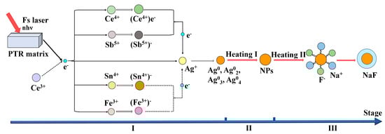 We propose the nonlinear photo–thermo–induced crystallization mechanism based on fs–laser irradiation in the P: Ce, Sb sample, as shown in Figure 6. In the first stage, fs-laser irradiation can trigger the nonlinear effects in the PTR glass matrix, a quantity of free electron-hole pairs can be produced. Ce3+ ions also have the opportunity to absorb photon energies to release electrons. All the photoinduced electrons can be captured by Ag+, Ce4+, Sb5+, Sn4+, and Fe3+ ions. Then [Ce4+]e−, (Sb5+)−, (Sn4+)−, and (Fe3+)− ions could transfer electrons to Ag+ ions. CeO2 and Sb2O3 dominate the electron transfer process according to the absorption and EPR spectra. The second and third stages (Heating I and Heating II) are responsible for repairing part of color centers, further growth of Ag NPs, and the formation of the NaF nanocrystals.