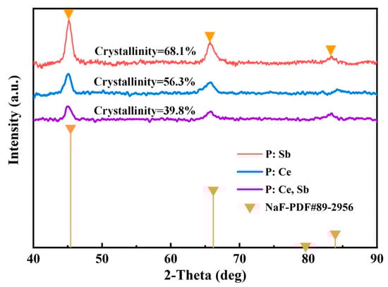 The powdered samples were also compared according to the XRD analysis shown in Figure 7. The original glass samples presented their amorphous nature. Nevertheless, the modified samples with laser exposure and heat treatment showed apparent crystal structure. The main diffraction peaks of NaF were observed at 45.15°, 66.11°, and 83.75°, which match the (200), (220), and (222) planes of NaF (ICSD card files nos. 89–2956). This identifies that such treatment of samples leads to the formation of NaF whether or not CeO2 or Sb2O3 is doped. Owing to the slight difference in full width at half maximum (FWHM), the particle size was estimated to be about 10–12 nm from the diffraction peaks using Scherrer’s equation [37] for all samples. However, the intensity of crystalline peaks changed obviously and decreased by a large margin for P: Ce, Sb. The degree of crystallinity [38] can be calculated from the area of crystalline peaks and divide by the area of all peaks (including crystalline and amorphous). The values commented on the corresponding curves showed that the P: Sb sample possessed higher crystallinity, which suggests that the degree of crystallinity could not be improved by doping CeO2, even the P: Ce, Sb sample could generate more SMCs during the irradiation process. Prolonging the treatment time may enhance the crystallinity in a certain range [39], as more SMCs may be fit for the thermal treatment with an extended period. The detailed kinetics of NaF crystallization in fs exposed PTR glass is complicated and needs more theory and experiment to research, which will be our future work.