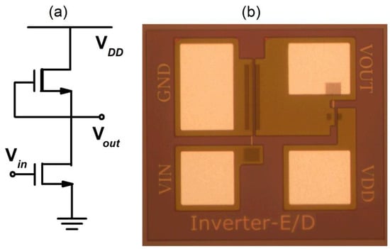 (a) A typical circuit schematic of the E/D-mode GaN inverter and (b) top view of the fabricated E/D-mode inverter.