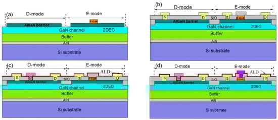 Schematic cross-section of (a) after p-GaN etching, (b) after source and drain formation and (c) after gate metal etching of the D-mode GaN high-electron-mobility transistor (HEMT) device and (d) after the gate metal etching of the E-mode GaN HEMT device.