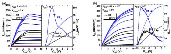 The DC output and transfer characteristics of E/D-mode HEMTs fabricated on the same wafer are plotted in Figure 3 and Figure 4. At room temperature (RT), the threshold voltage VTH is +1.2 V and −14.5 V for E-mode and D-mode GaN HEMT by linear extraction method, respectively. The maximum drain current density IDS,max is 312 mA/mm (at VGS = 7 V) for the E-mode HEMT and 378 mA/mm (at VGS = 2 V) for the D-mode HEMT. The maximum current density for D-mode HEMT is lower than normal devices should be, as a result of the lower Al concentration of the AlGaN barrier layer. As the limitation of the probe, the highest test temperature is 200 °C in the paper. At 200 °C, the VTh of the E-mode HEMT is 1.1 V and with 0.1 V drift. The E-mode HEMT exhibits a maximum current density of 152 mA/mm at 200 °C, which is about 52% lower than that at room temperature. The lower maximum current density at high temperature may be due to the low mobility of the 2DEG, caused by impurity scattering [13,14]. For the D-mode HEMT the VTH increases to −12.4 V, with +2.1 V drifting at 200 °C. The larger VTH shifting for the D-mode HEMT at high temperature may be due to the fact that the 2DEG is captured by the interfaces of the gate metal/Al2O3/AlGaN structure [15]. The maximum current density of the D-mode exhibits 64% lower and it is 179 mA/mm.