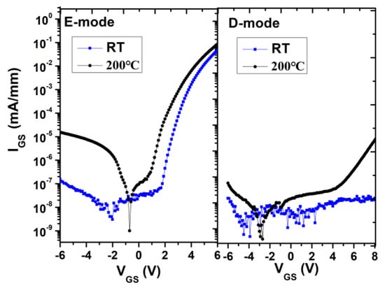 Gate leakage current for both E-mode and D-mode at room temperature and 200 °C.