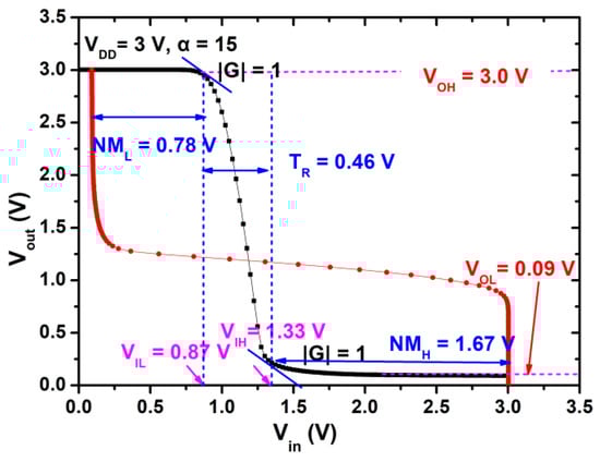 Static voltage transfer characteristics of the inverter with α = 15 measured at supply voltage VDD = 3 V.