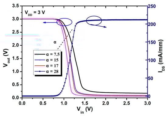 Figure 6 shows the measured voltage transfer characteristics for E/D-mode GaN inverters of different α with VDD = 3 V. Table 1 summarizes the parameters of the inverters.