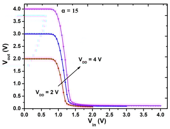 The static voltage transfer curve of the inverter with different α at VDD = 3V.