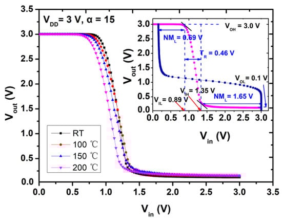 High-temperature performance of the inverter circuits is characterized by varying the temperature from 25 °C to 200 °C in Figure 8. The insert figure plots the DC output and transfer characteristics of the inverter at 200 °C. Table 3 summarizes the parameters of the inverters at different temperature with VDD = 3 V and α = 15.