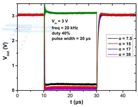 The transient output waveforms with input of 20 kHz square wave from 0 to 3 V with different α.