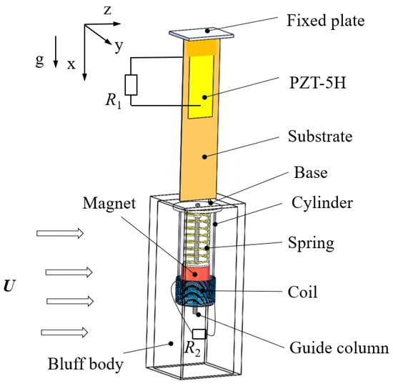 Working principle of GPEEH: on the one hand, wind flows through the bluff body from the positive direction of the z-axis. When the wind speed reaches the start-up wind speed of this structure, the aerodynamic forces at the y-axis direction component generated to drive the bluff body to make a stable cyclic vibrated movement which causes PZT-5H to deform. Simultaneously, the positive piezoelectric effect causes a potential difference between the upper and lower surfaces of the piezoelectric sheet, supply power to load R1 through wires. On the other hand, the swing of the bluff body promotes the magnet to move in the direction of the guide column. The displacement is related to the vibrated behavior of the end of the cantilever beam, so the transverse displacement of the cantilever beam and the displacement of the magnet along the guide column direction are coupled with each other. The vibrating magnets hold the movement of cutting the magnetic induction line in the coil. According to Faraday’s law of electromagnetic induction, there will be currently generated in the coil, which can supply power to the load R2.
