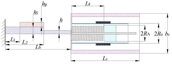 The cross-sectional view is shown in Figure 2. It is found that the cantilever beam is a stepped plate, which prevents PZT-5H from breaking. Explain the symbols in the picture: h1, h, hp are the thickness of the front and hind step of the cantilever beam, and the thickness of the piezoelectric sheet, respectively. Lb, Ls, L1, L2 are the total length of the cantilever beam and the bluff body, the distance between the fixed end and the left, right faces of the piezoelectric sheet, and, respectively. bs is the width of the bluff body, and the distance from the top surface of the bluff body to the bottom surface of the magnet is Lk, which contains the free extension of spring Lk0 and spring displacement change during the balance . Ro, RA is outside and inside the radius of the cylinder, respectively.