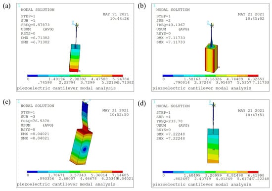 To determine which vibration mode dominates the cantilever beam vibration, this paper uses finite element software to perform modal analysis of GPEEH and the results are shown in Figure 4. It can be found that these four-order modes are bending vibration, torsional vibration, bending vibration where the cantilever beam has been deformed, and bending vibration along the width direction of the cantilever beam. As shown in Figure 4, the vibration frequencies of the first to fourth modes are 5.57873 Hz, 43.1367 Hz, 76.5378 Hz, and 233.78 Hz, respectively. The frequency of energy source captured by environmental energy is generally low, the first order vibration frequency of the energy harvesting structure is usually studied [43]. The first-order mode (bending vibration) is the dominant vibration mode of the primary energy trap.