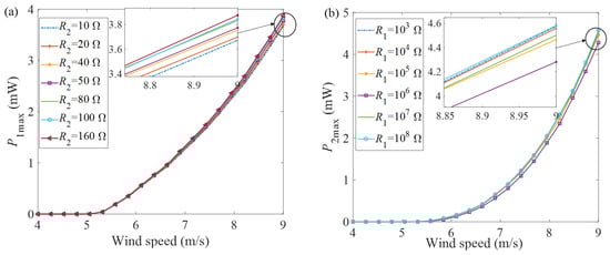 In order to study the maximum output power of GPEEH, it is necessary to analyze its optimal matching load. The effect of the matching resistance R1 of the GPEH and the matching resistance R2 of the EEH on the output performance of the GPEEH is studied. Set R1 to a fixed value (set R1 = 1 × 106 Ω), change the load resistance R2, then analyze the influence of the change of R2 on the output power of the GPEH, and use the analysis results to draw the curve of the influence of wind speed changes on the maximum output power P1max of the GPEH, as shown in Figure 5a. Keep R2 unchanged (set R2 = 40 Ω), change the load resistance R1, analyze the effect of the change of R1 on the output power P2max of the EEH, and use the analysis results to draw the curve of the electromagnetic maximum output power P2max as the wind speed changes, as shown in Figure 5b.