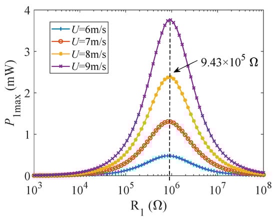 The curve diagram of the maximum output power P1max of GPEH with its load resistance R1 (= 6, 7, 8, 9 m/s).