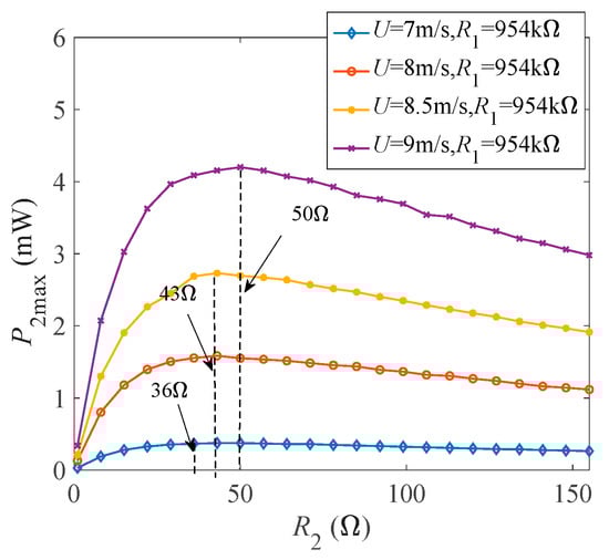 Keeping the load resistance R1 is 9.43 × 105 Ω. When the wind speed is 7, 8, 8.5, 9 m/s, the output power P2max of the EEH varies with changing of its load resistance R2, as shown in Figure 7. It can be seen from Figure 7. that when the load resistance R1 is the same, the maximum output power of the electromagnetic part P2max increases with the increase of wind speed. When the load resistance R2, the maximum output power of the EEH increases first and the rate of increase is faster, but then gradually decreases after reaching the peak, and the changing trend becomes slower. Different wind speeds correspond to different optimal matching load resistances R2, ranging from 36–50 Ω. Because P2max of the same curve fluctuates very little in this interval, we set the optimal electromagnetic matching load resistance R2 as 40 Ω.