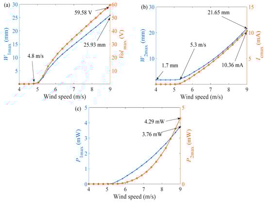 Curves of output parameters changing with wind speed under optimally matched loads (a) W1max and Volmax (b) W2max and Icmax (c) P1max and P2max.