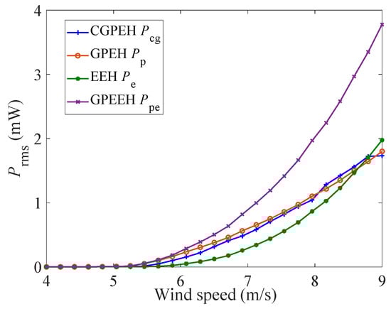 (1) The method of numerical analysis determines the best matching load resistance of the system. On this basis, the influence of wind speed on the output characteristics of GPEH and EEH is studied. Numerical simulation results show that the starting wind speed of GPEH is about 4.8 m/s, and the starting wind speed of EEH is 5.3 m/s; The effective output power of GPEEH is 3.78 mW, and the effective output power of CGPEH 1.71 mW. The improved efficiency is 121%