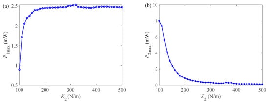 In Figure 10a, as the spring stiffness K2 gradually increases, the P1max of GPEH first increases sharply and then remains at a constant when K2 is 200 N/m. This is mainly because when K2 is in a small range, the vibrated frequency of the cantilever beam gradually increases, as shown in Figure 10b, which increases the vibrated speed at the end of the cantilever beam, simultaneously the vibrated displacement increases, and finally make the output power voltage increase. However, when K2 increases to a certain value, the value of (M2 is a fixed value) is nearly negligible in the proportion of Lk (including the spring free body constant Lk0, the elongation caused by gravity ), so the spring stiffness has no effect on the output power P1max.