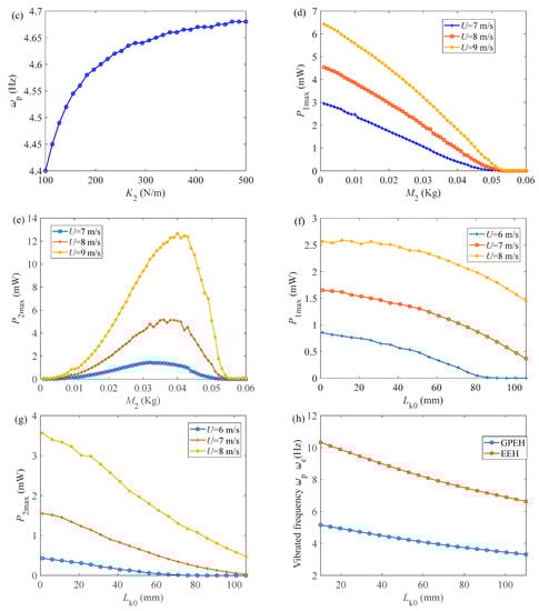In Figure 10b, the output power of GPEH decreases to zero with nearly linear as the magnet mass M2 increases. This is mainly due to the longitudinal arrangement of the cantilever beam. The increase of gravity of the magnet will increase the overall gravity of the bluff body. The gravity will pull the cantilever and suppress the vibration of the cantilever. When gravity reaches a value, the bluff body does not vibrate and the system output is zero. Figure 10e. The curve shows a trend that is similar to normal distribution under different wind speeds with increasing of M2. This is mainly due to the fact that when the spring stiffness K2 is constant, with increasing of the magnet mass M2, the inertia effect enhances, and the vibrated displacement of the magnet will increase, which makes the output power P2max increase. When M2 increases to a certain value, the P2max reaches the peak, and then gradually decreasing cantilever beam displacement begins to affect the magnet displacement, resulting in a decrease in the magnet displacement and a decrease in the output power. Additionally, the higher the wind speed, the larger the magnet mass M2 corresponding to the peak power. Combining Figure 10b,e should try to keep in within the range of 0.025–0.03 Kg, so that both EEH and GPEH have good output characteristics.