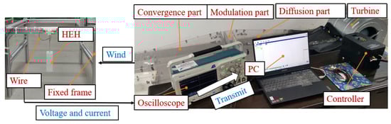 To test the energy capture effect of the GPEEH and the correctness of the mathematical model, a prototype was made and the output performance test experiment of the GPEEH was carried out. The experiment equipment is shown in Figure 11. The Turbofan (DWF 3.15L, Shandong Kepuda Fan Co., Ltd., Dezhou, China) provides the wind source and filters the wind into the stable wind through the diffusion part, modulation part, and convergence part of the wind tunnel. Controler (V8 4T 4R0GB, Shenzhen Veko Technology Electronics, Ltd., Shenzhen, China) controls the wind speed of the wind tunnel. The experimental output signal collector is an oscilloscope (MDO 3014, Tektronix Inc., Beaverton, OR, USA), and the measured data can be stored in the PC using kickstart software. The base, cylinder, and bluff body are 3D printed with a resin with a density of 1140 kg/m3. The 3D model of overall and split GPEEH and split CPEH is shown in Figure 12.